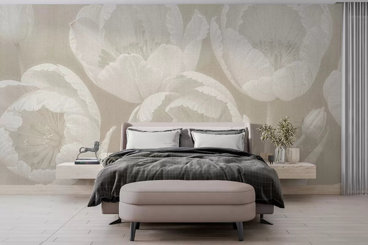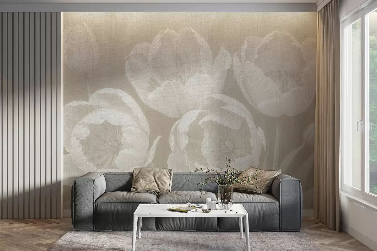 Fototapetai Baltų tulpių piešinys su minkštu, drobės tekstūros rausvu neryškiu fonu minimalistiniu vienspalviu spaudiniu Nr. w08193v1