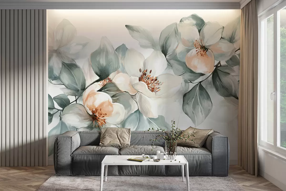 Fototapetai Švelnios baltos ir rožinės magnolijos gėlės su švelniai žaliais lapais šviesiame fone Nr. w08220