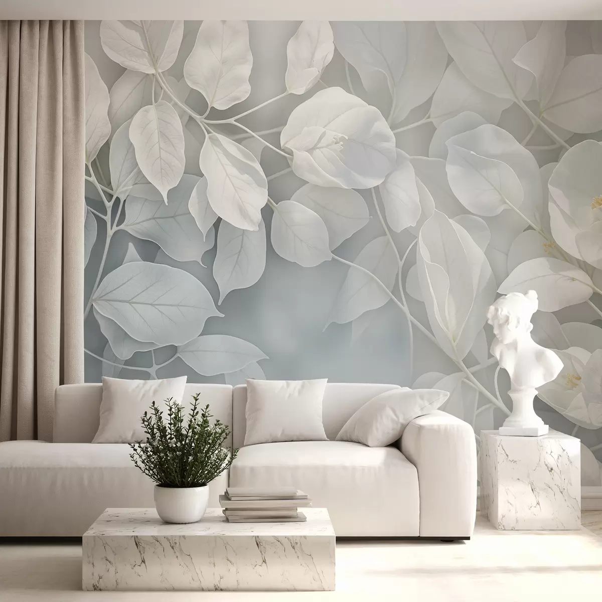 Fototapetai Minkštos, švelnios baltos gėlės su pilkai žaliais lapais neryškiame fone, sukuriančios ramią atmosferą Nr. w08232