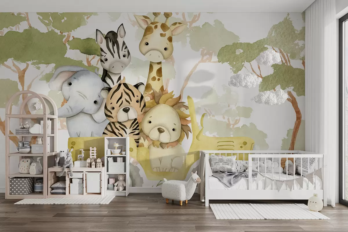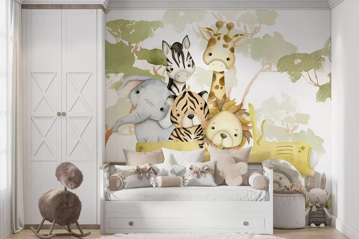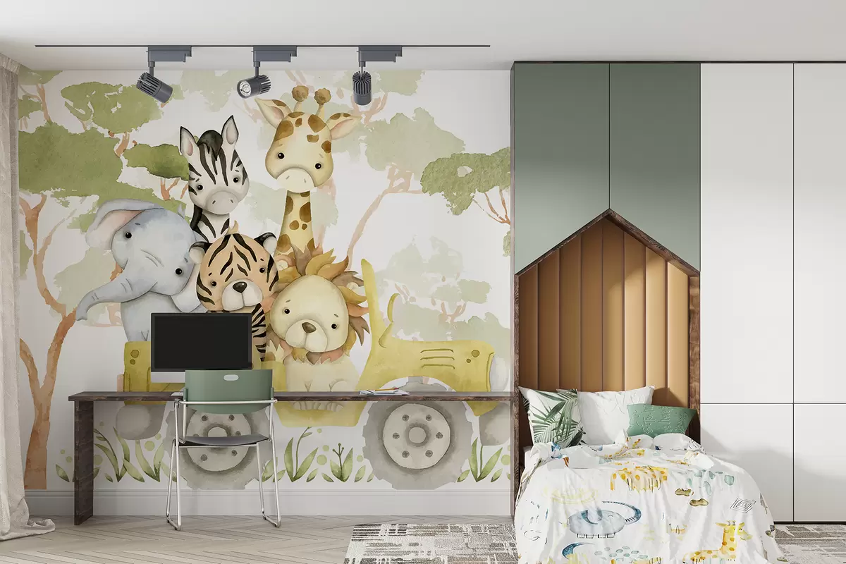 Fototapetai Geltonas žaislinis sunkvežimis, vežantis žirafą, tigrą, triušį ir dramblį žalios lapijos fone Nr. w08233
