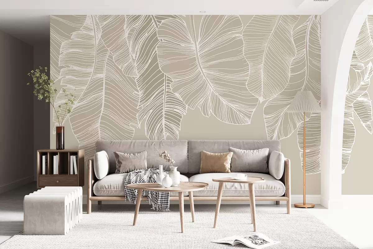 Fototapetai Balti atogrąžų gėlių lapai su šviesiai smėlio spalvos fonu, minimalistiniu linijiniu dizainu Nr. w08235