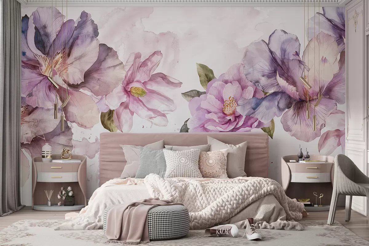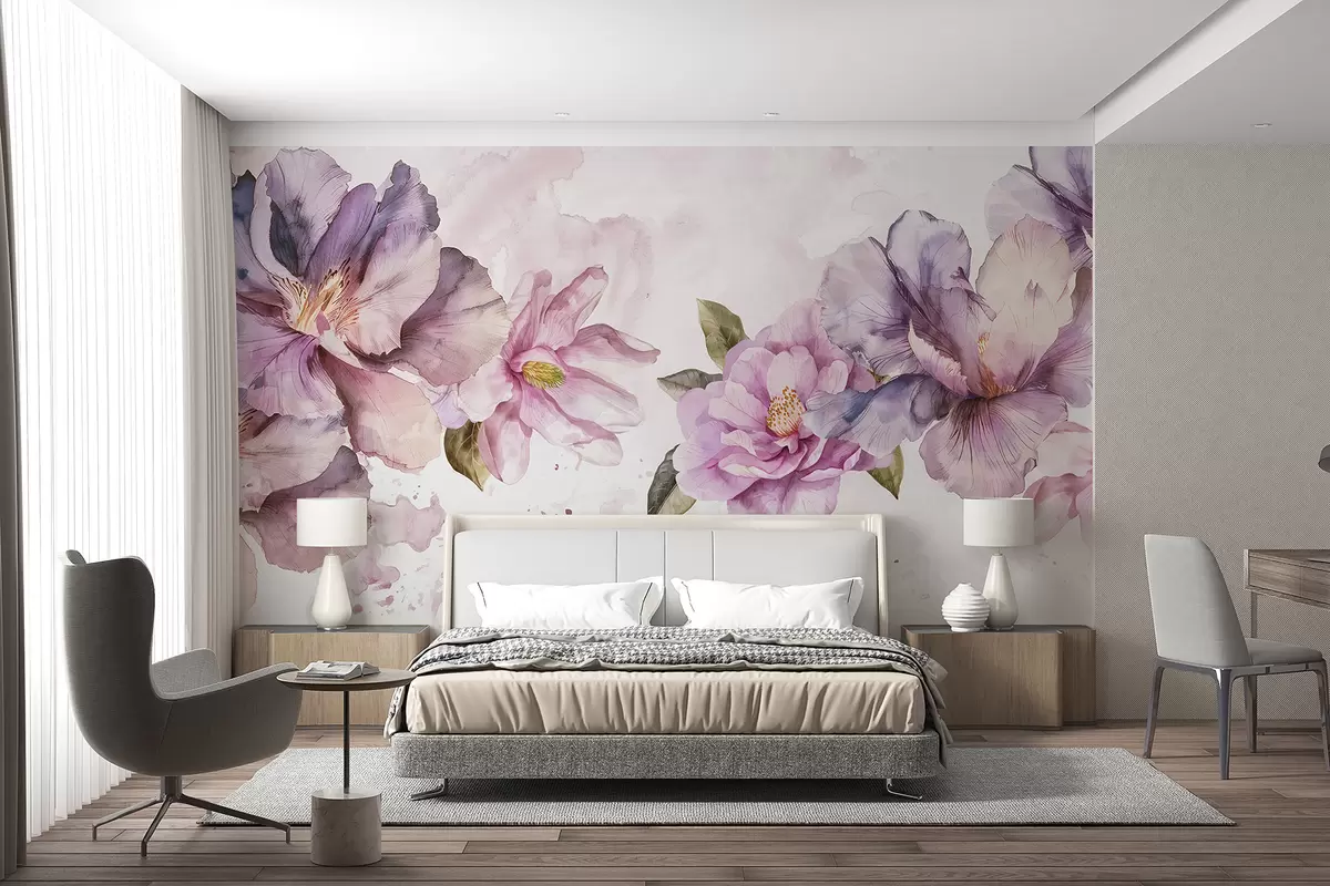 Fototapetai Šviesiame fone švelnios rožinės ir violetinės akvarelės gėlės su švelniais žiedlapiais ir žaliais lapais Nr. w08238