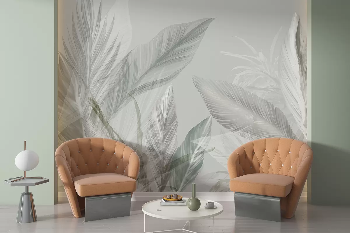 Fototapetai Šviesiame fone plūduriuojančios švelnios baltos, žalios ir pilkos plunksnos bei tropiniai lapai Nr. w08241