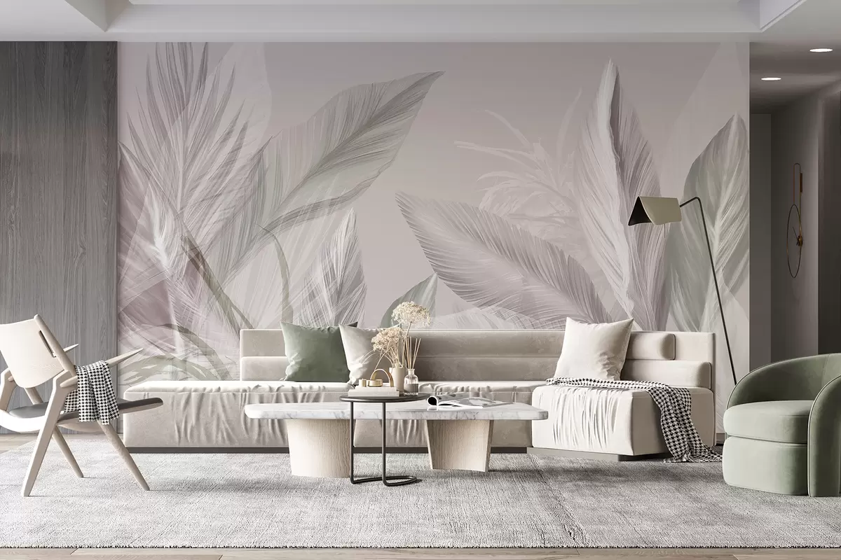 Fototapetai Švelnios baltos, rožinės ir pilkos spalvos plunksnos ir tropiniai lapai, plaukiojantys šviesiame fone Nr. w08241v1