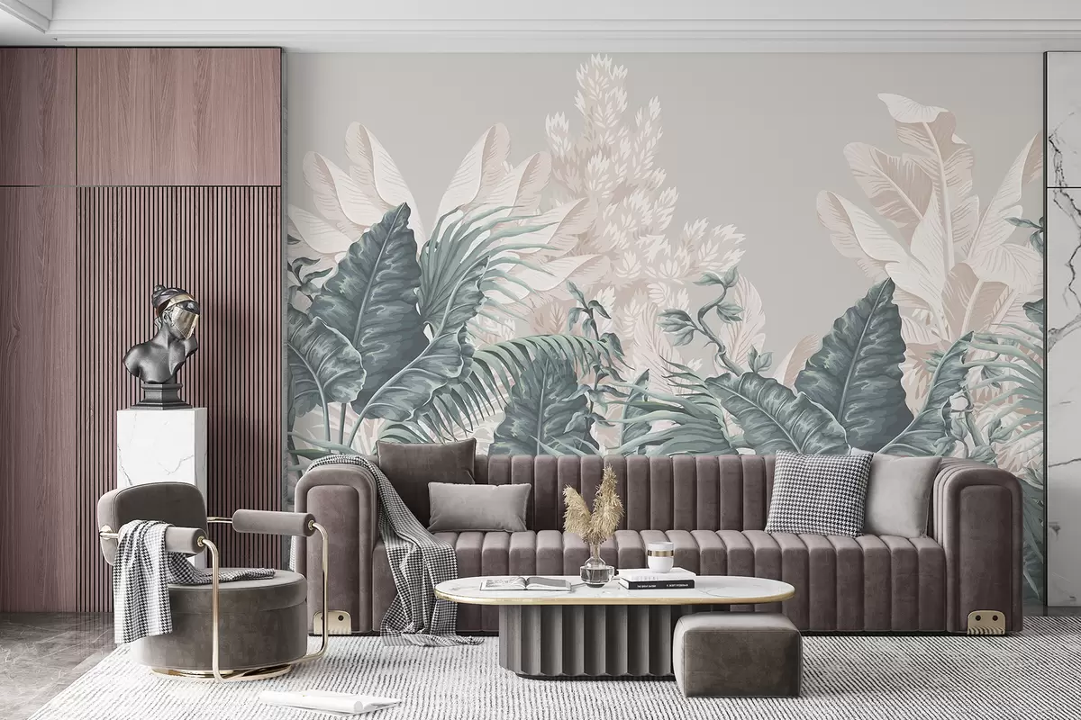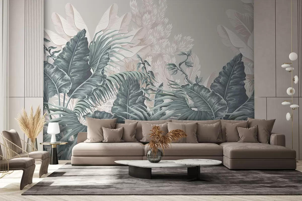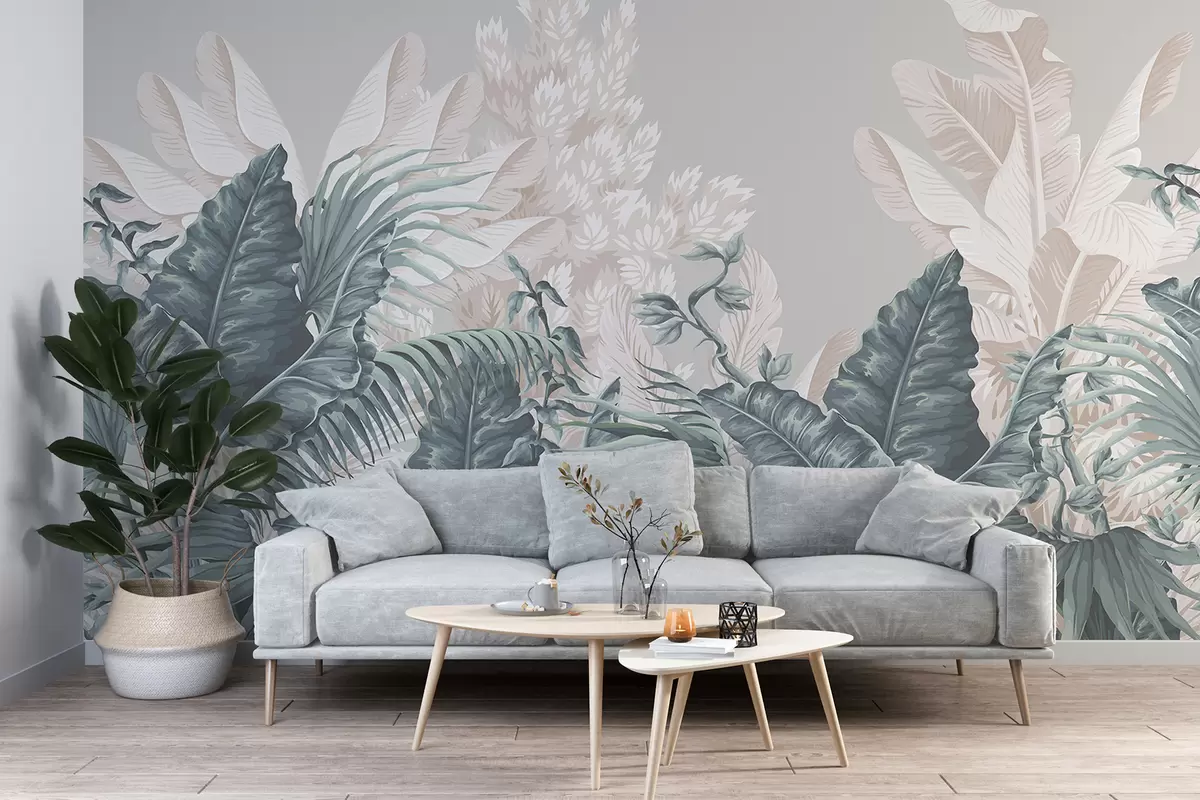 Fototapetai Atogrąžų džiunglių scena su dideliais žaliais lapais ir gėlėmis pirmame plane, kurianti sodrią atmosferą Nr. w08242