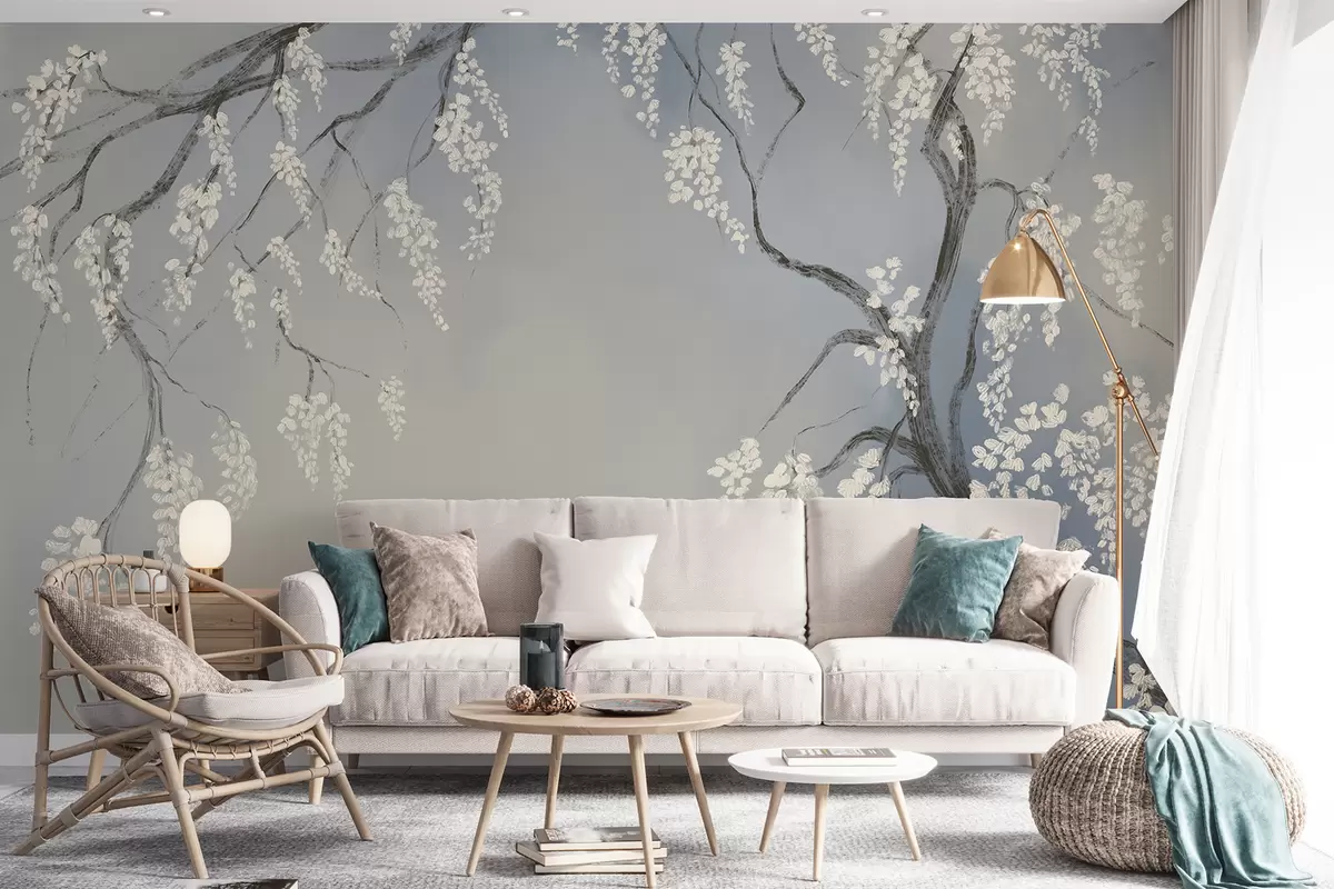 Fototapetai Švelnus baltas vyšnių medis su žiedais, žydinčiais ant šakų mėlyname fone Nr. w08243v1
