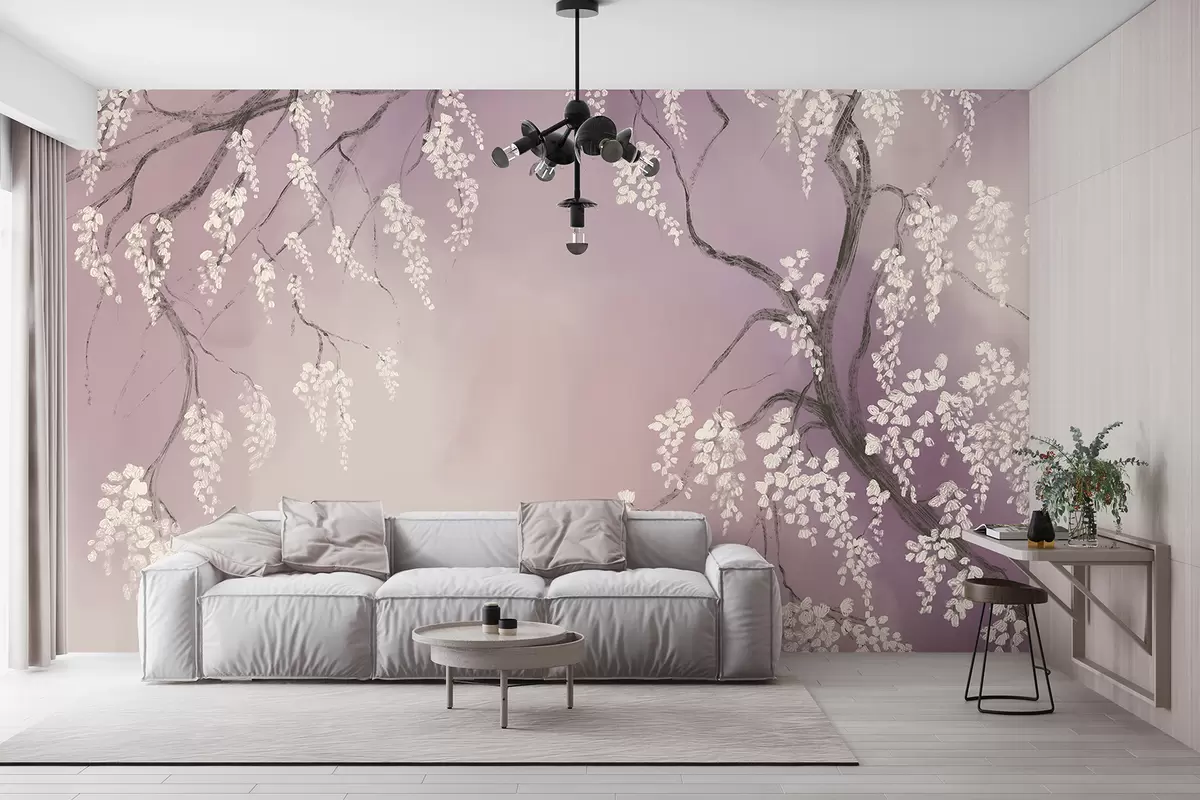 Fototapetai Švelnus baltas vyšnių medis su žiedais, žydinčiais ant šakų rožiniame fone Nr. w08243v2
