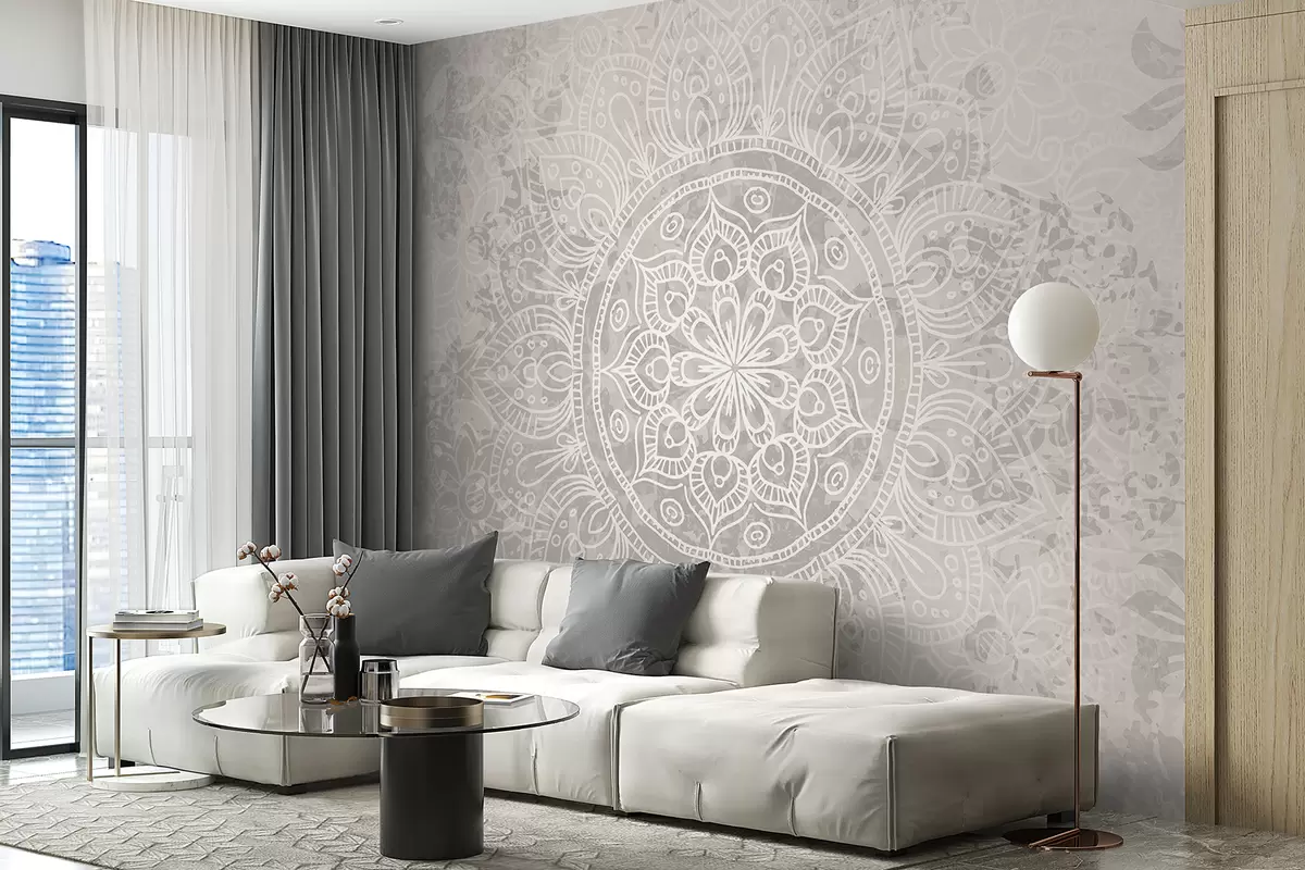 Fototapetai Išsamus baltos mandalos raštas šviesiai pilkos tekstūros vintažiniame fone Nr. w08246