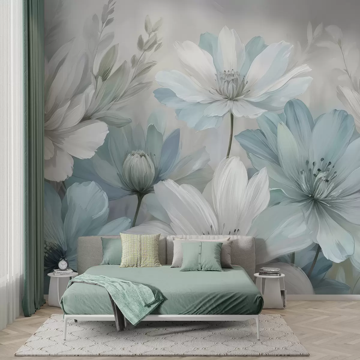 Fototapetai Baltų ir šviesiai mėlynų į ramunes panašių gėlių stambiu planu tapybos menas švelniais, neryškiais fonais Nr. w08247