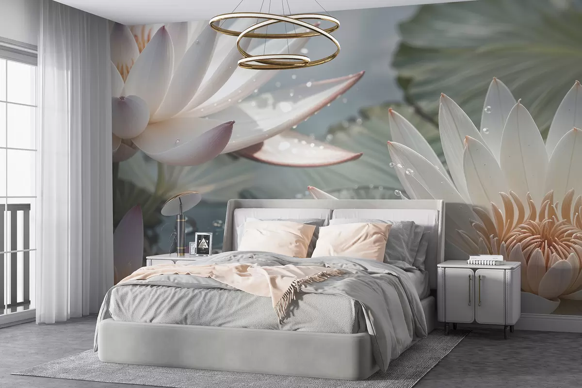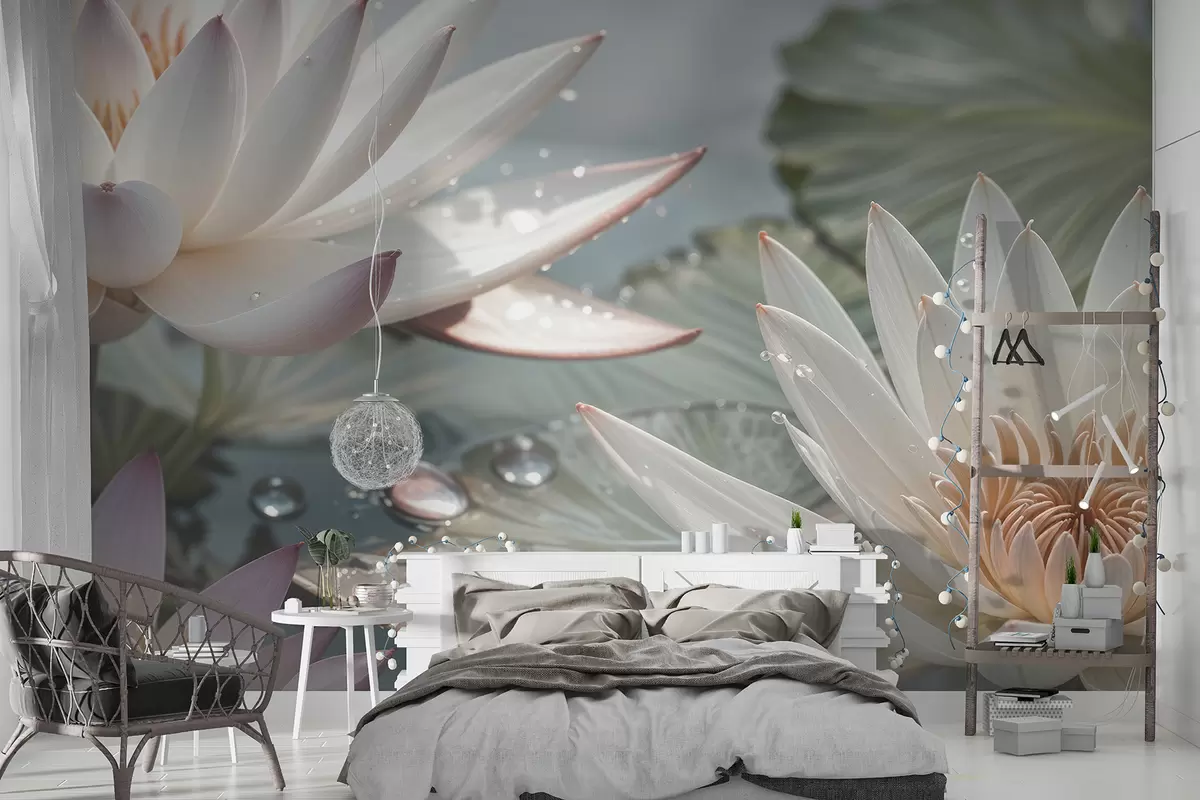 Fototapetai Baltų lotoso žiedų su vandens lašeliais ant žiedlapių stambiu planu neryškiame žaliame fone Nr. w08252