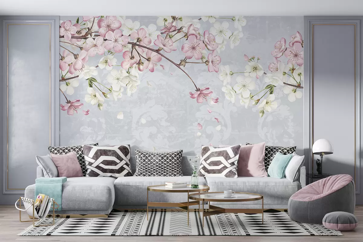 Fototapetai Visiškai žydinčios rausvos ir baltos vyšnios žiedai, kurių žiedlapiai švelniai krenta tekstūriniame mėlyname fone Nr. w08254