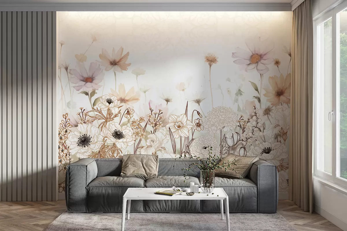 Fototapetai Baltų, smėlio ir rausvų gėlių ir lapų laukas švelniame, neryškiame gėlių fone Nr. w08259