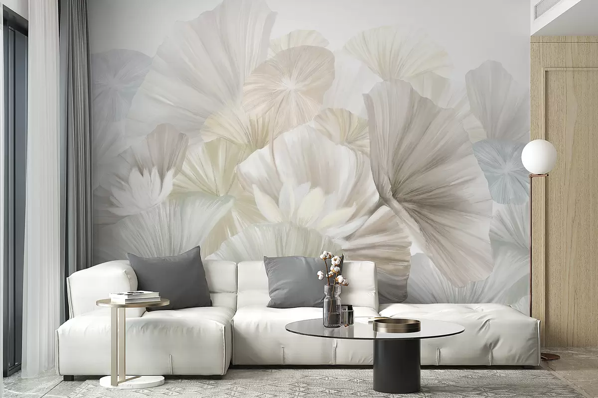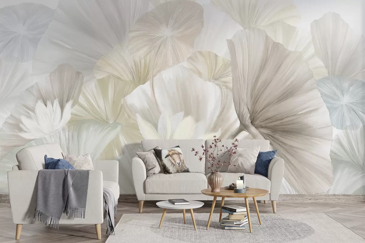Fototapetai Švelnūs žali lotoso lapai ir balti žiedai su švelniais plunksniniais žiedlapiais, išdėstyti natūralioje meno kompozicijoje Nr. w08265