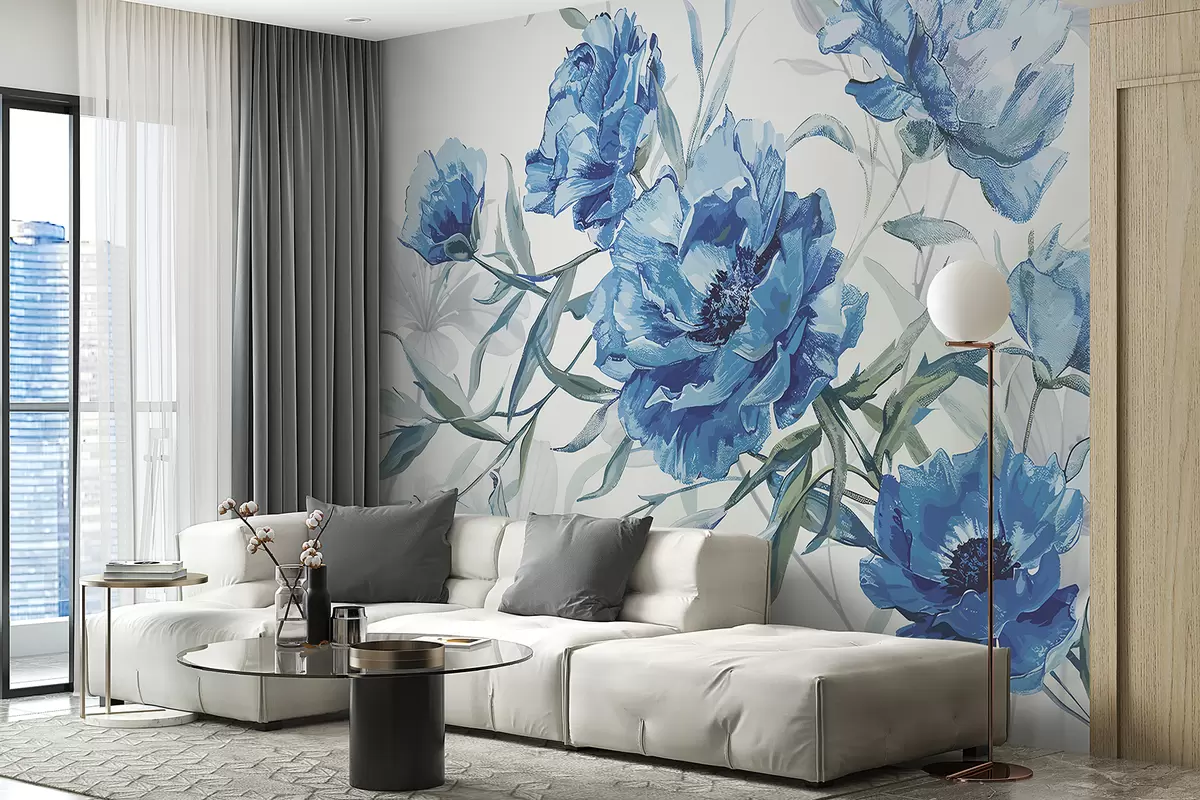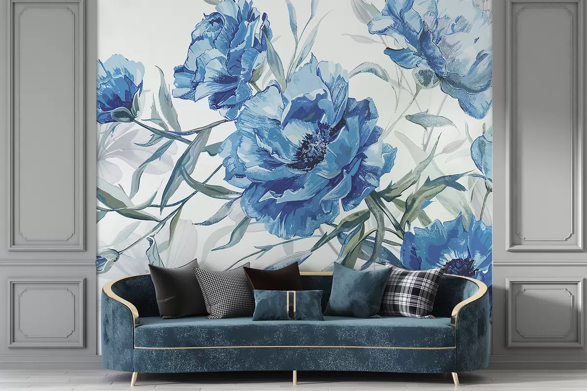 Fototapetai Mėlynų bijūnų paveikslas su vešlia lapija šviesiame abstrakčiame fone Nr. w08274v1