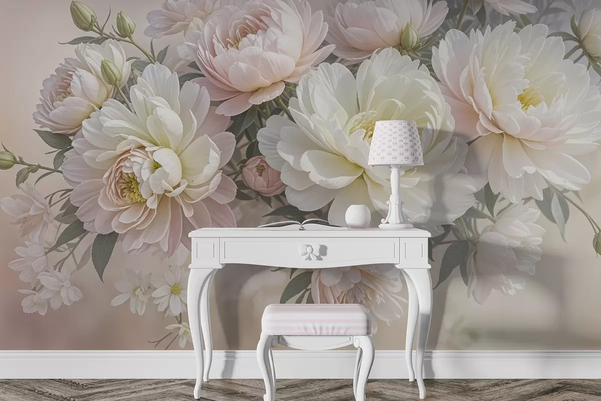 Fototapetai Gausių, pastelinių spalvų bijūnų ir kitų gėlių puokštė švelniame, neryškiame fone  w08276