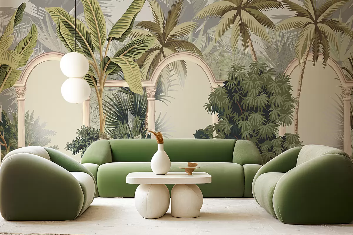 Fototapetai Arkos su atogrąžų kraštovaizdžiu, vešliomis palmėmis ir kita lapija šviesiame fone Nr. w08306