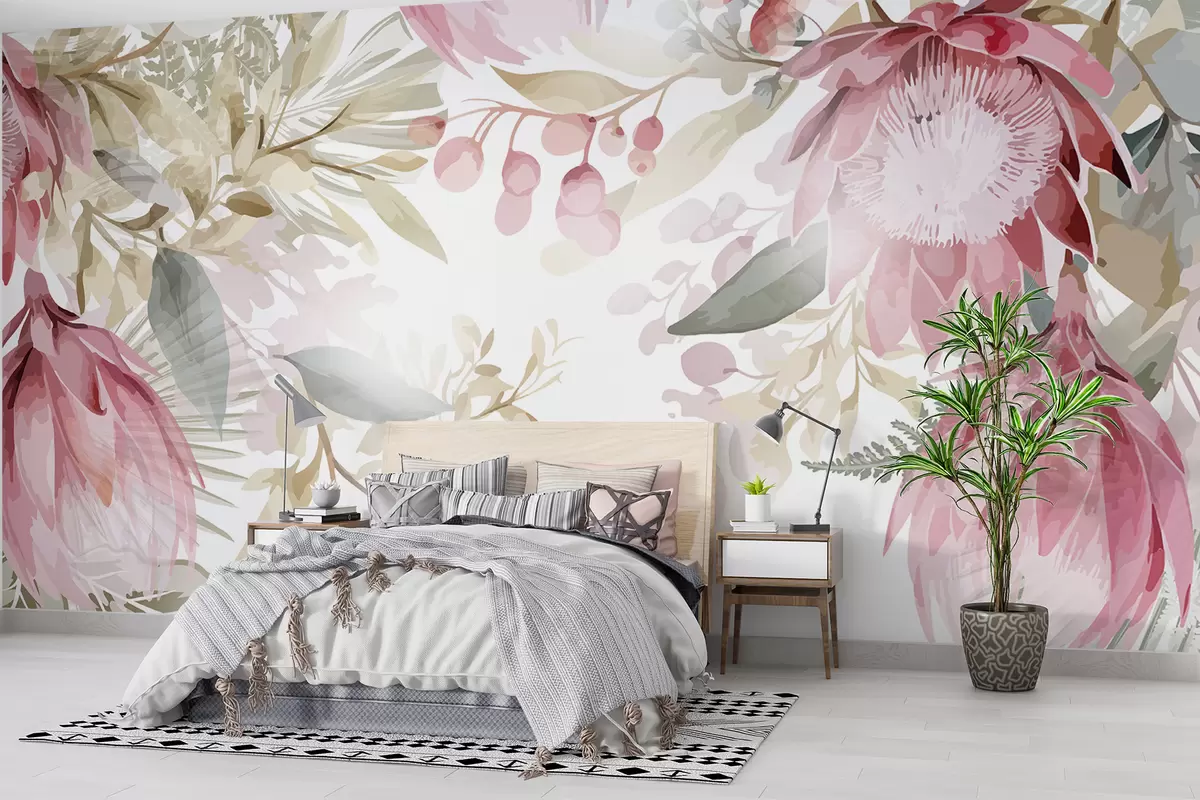 Fototapetai Didelės rausvos ir baltos skaidrios proteos su sodriais žaliais lapais šviesiame fone w08315