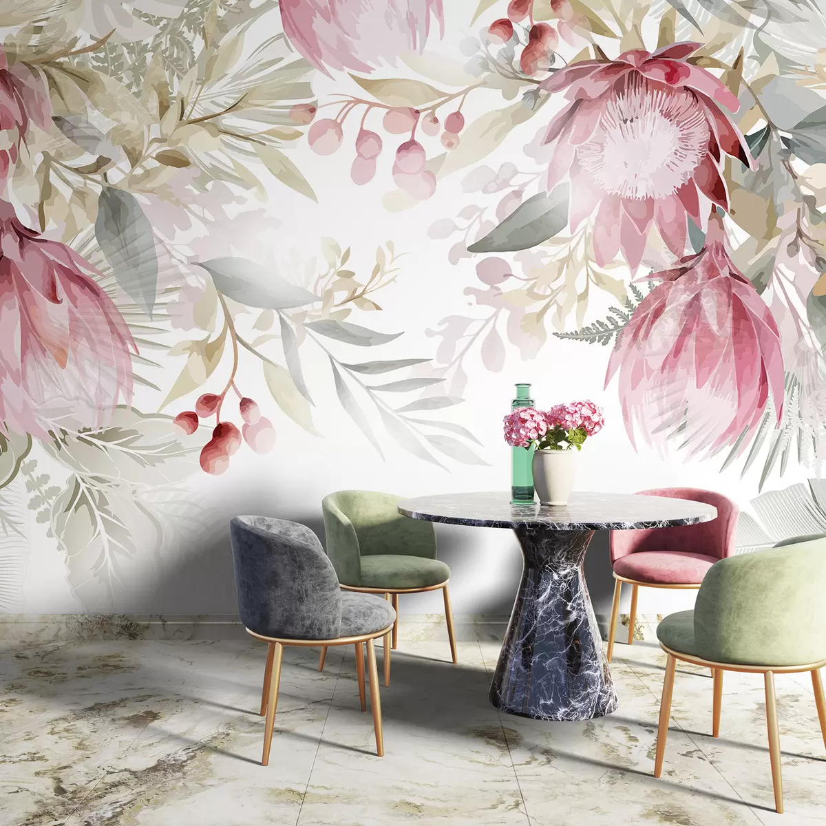 Fototapetai Didelės rausvos ir baltos skaidrios proteos su sodriais žaliais lapais šviesiame fone Nr. w08315