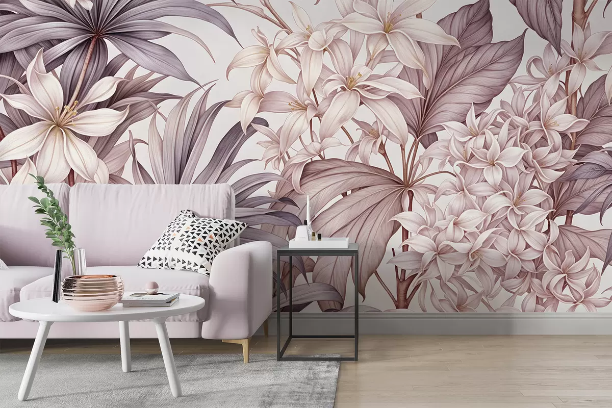 Fototapetai Atogrąžų gėlių raštas su didelėmis baltomis ir šviesiai rožinėmis gėlėmis, bordo lapais ir neutraliu fonu Nr. w08318v1