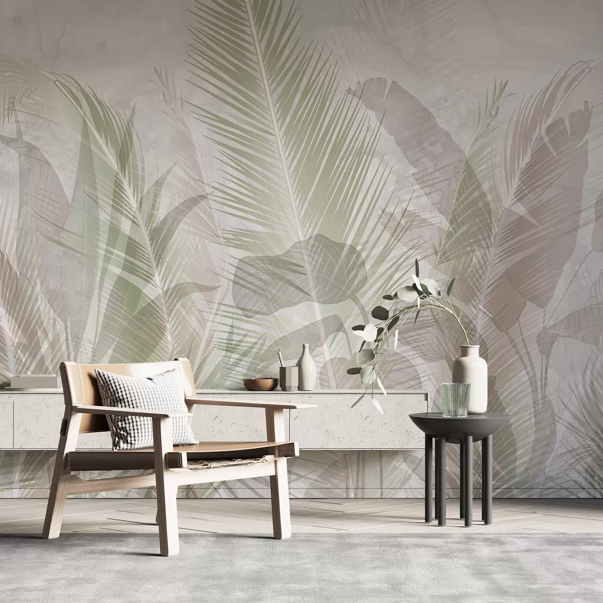 Fototapetai Švelnių pastelinių spalvų atogrąžų palmių lapai, neryškus ir miglotas tekstūrinis fonas Nr. w08326