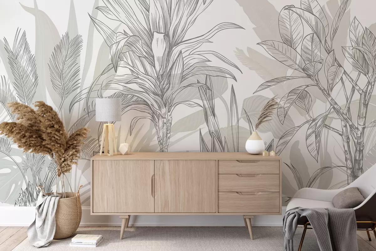 Fototapetai Atogrąžų grafiniai augalai su dideliais, vešliais lapais ir žiedais, pilkų ir baltų atspalvių su žalių gėlių siluetais Nr. w08327