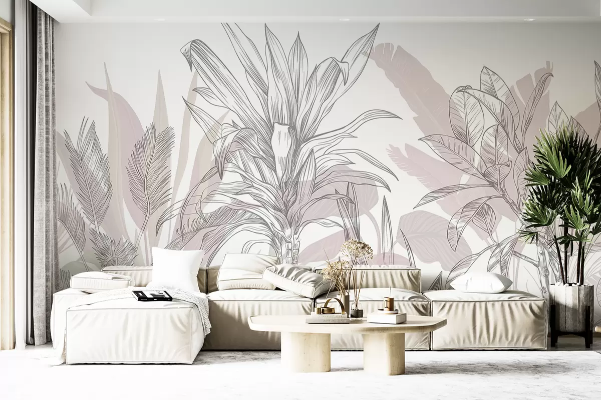 Fototapetai Atogrąžų grafiniai augalai su dideliais, vešliais lapais ir žiedais pilkų ir baltų atspalvių su rausvais gėlių siluetais Nr. w08327v1
