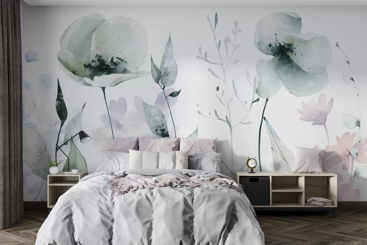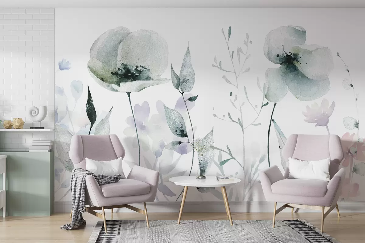 Fototapetai Pastelinės akvarelės gėlės su subtiliais žiedlapiais ir lapais, pilkos, baltos ir šviesiai rožinės spalvos atspalviais baltame fone Nr. w08332