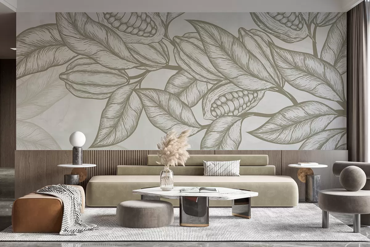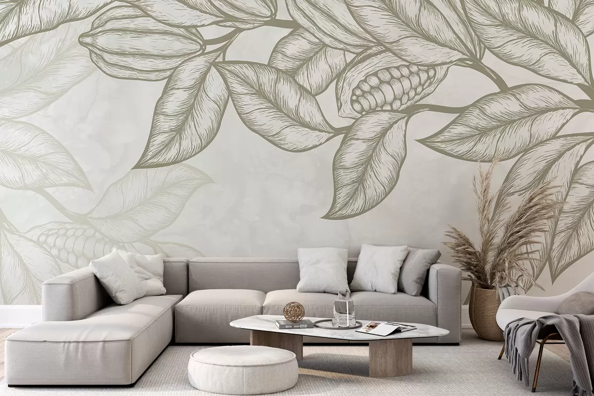 Fototapetai Detalus linijinis kakavos lapų ir lapijos piešinys, atspausdintas natūraliu, ekologišku būdu Nr. w08334