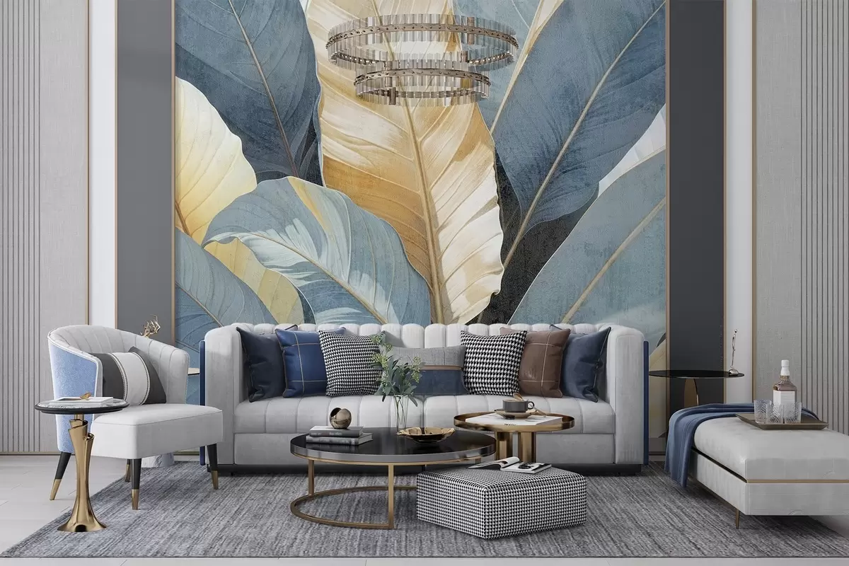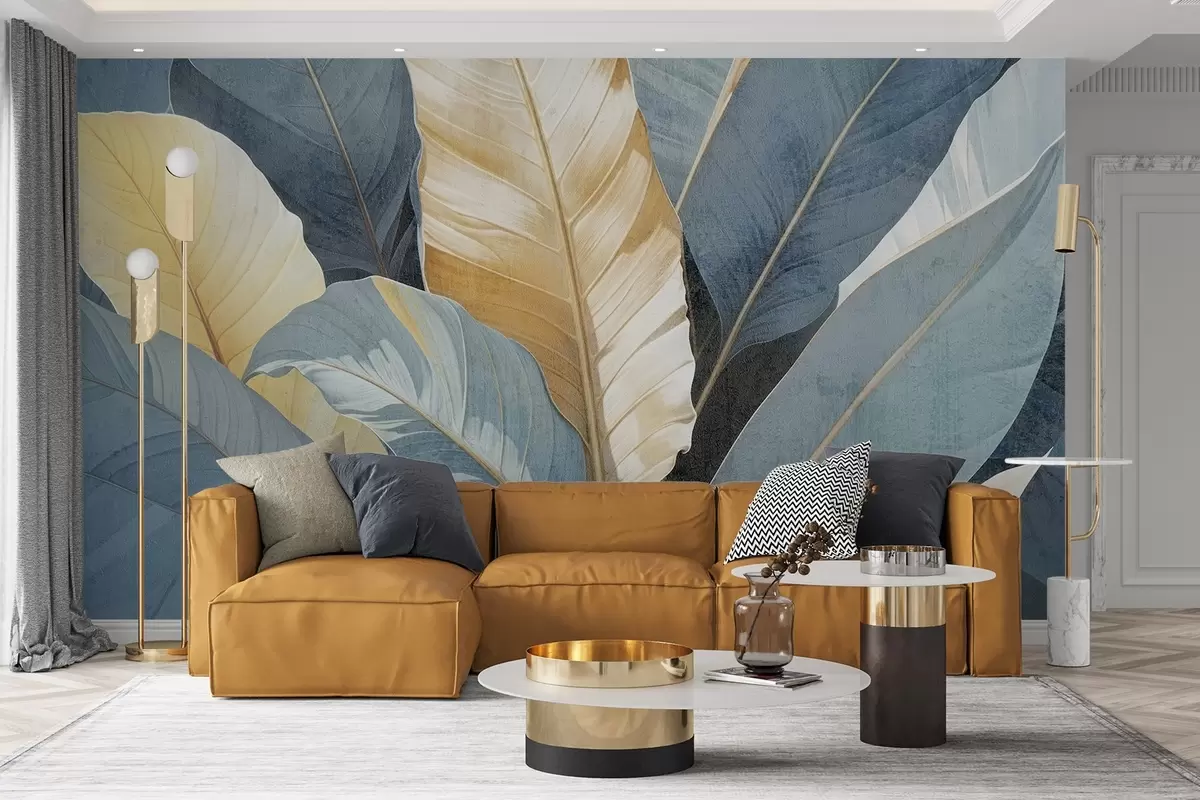 Fototapetai Stambiu planu matomi dideli vešlūs, tekstūriniai dekoratyviniai mėlynos, žalios ir geltonos spalvos atogrąžų lapai Nr. w08373