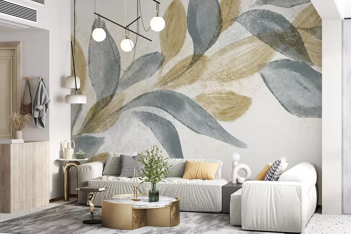 Fototapetai Pastelinės tekstūros smėlio ir mėlyni lapai su švelniais kraštais ir purslais šviesiame fone Nr. w08374