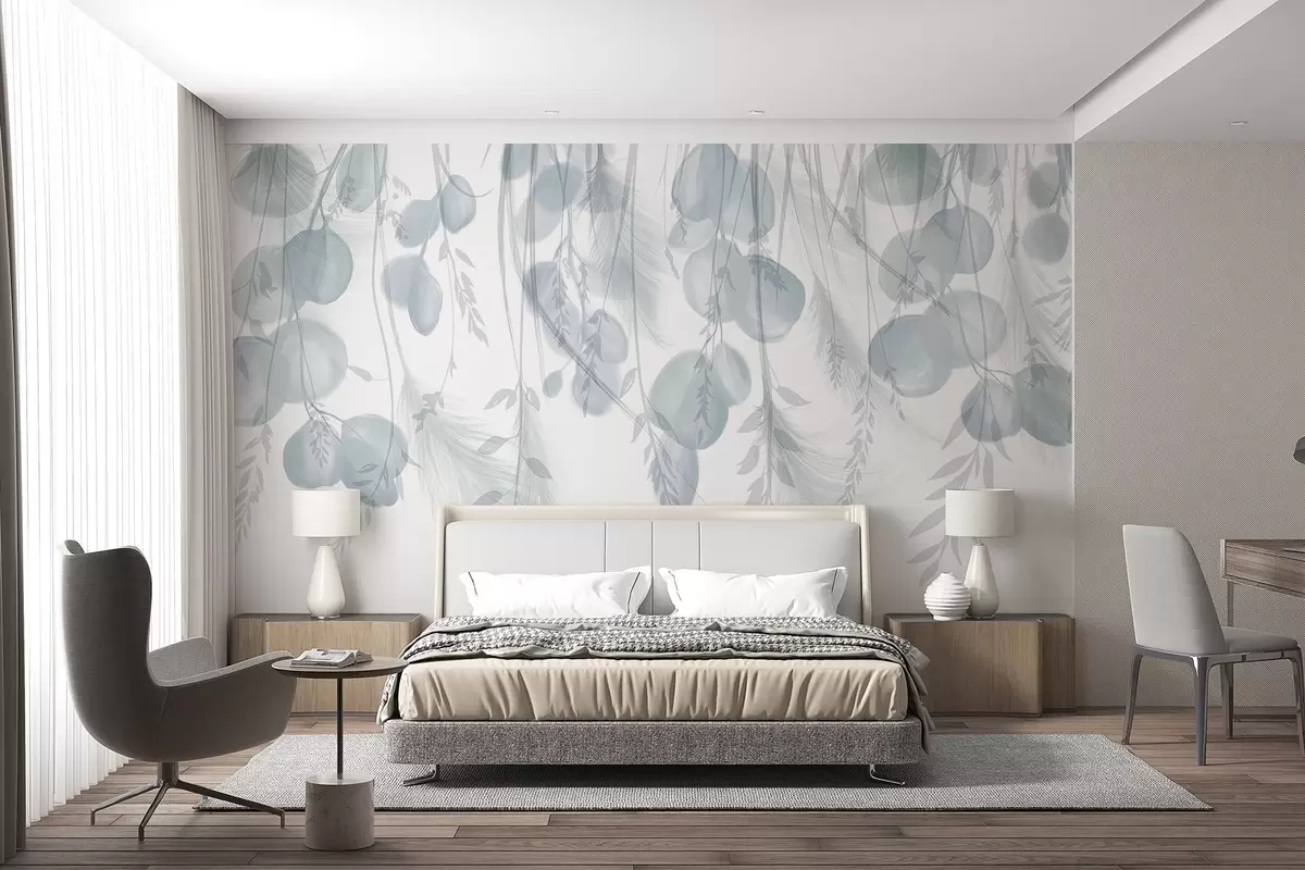 Fototapetai Švelnūs pilki ir pasteliniai žali eukaliptų lapai krenta, sukurdami giedrą ir raminančią atmosferą Nr. w08380