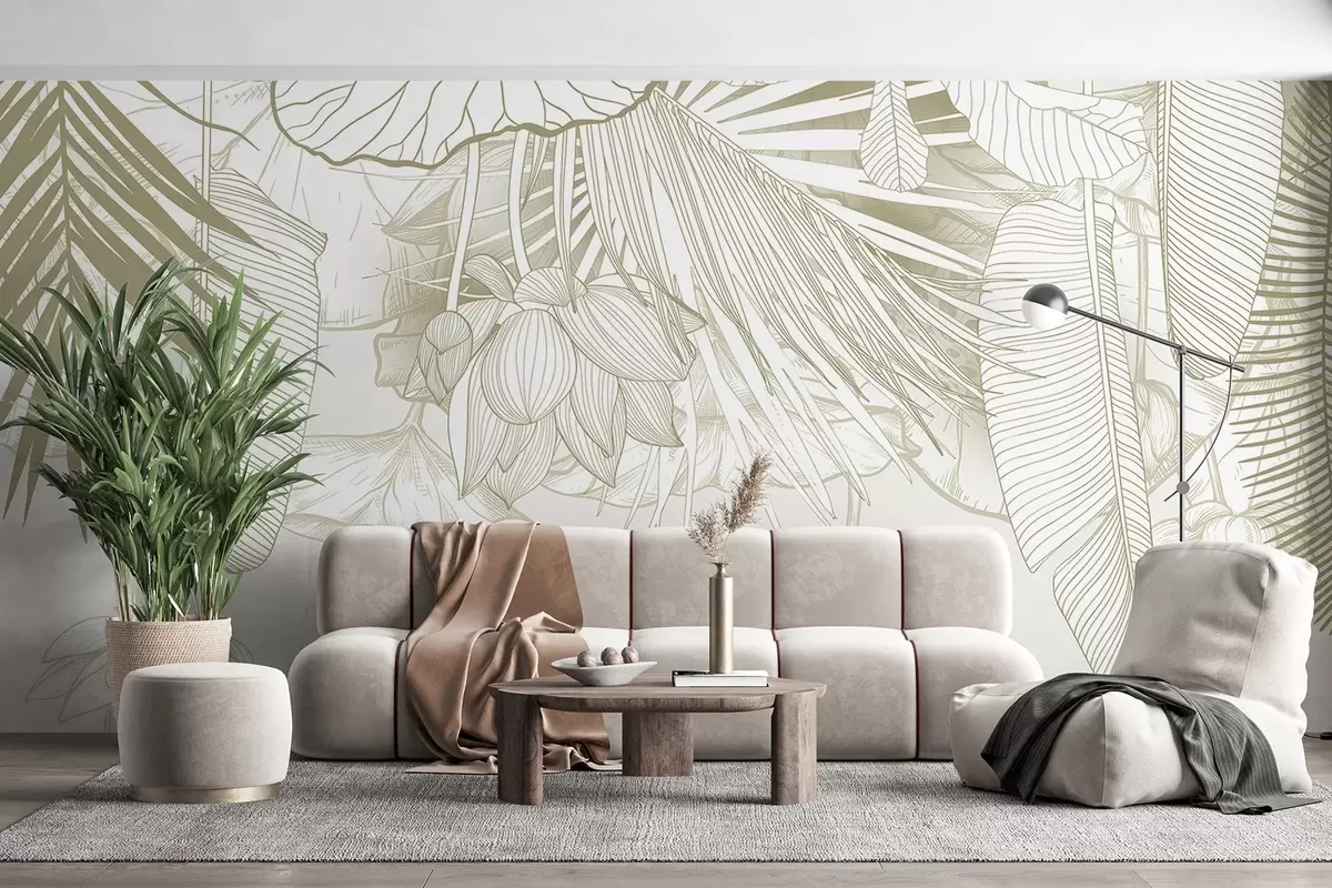 Fototapetai Smėlio spalvos gėlių rašto su dideliais, persidengiančiais žiedlapiais ir vienspalviais lapais vaizdas stambiu planu Nr. w08389