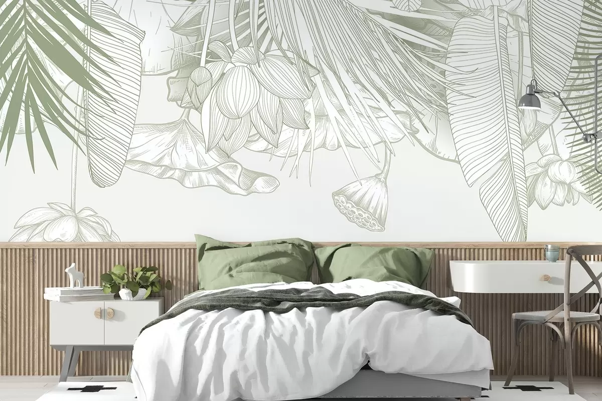 Fototapetai Žalio gėlių rašto su dideliais persidengiančiais žiedlapiais ir vienspalviais lapais vaizdas stambiu planu Nr. w08389v1