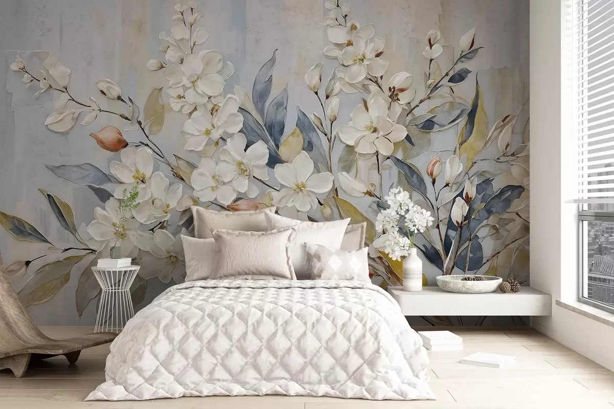 Fototapetai Gėlių pasteliniai švelnūs balti žiedai su geltonais centrais, apsupti sodrių žalių lapų ir šakų Nr. w08399v1