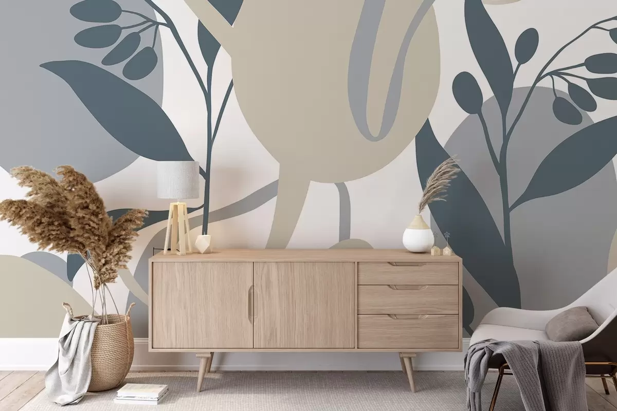 Fototapetai Minimalistinis abstraktus gėlių raštas su smėlio ir pilkos spalvos figūromis baltame fone Nr. w08400