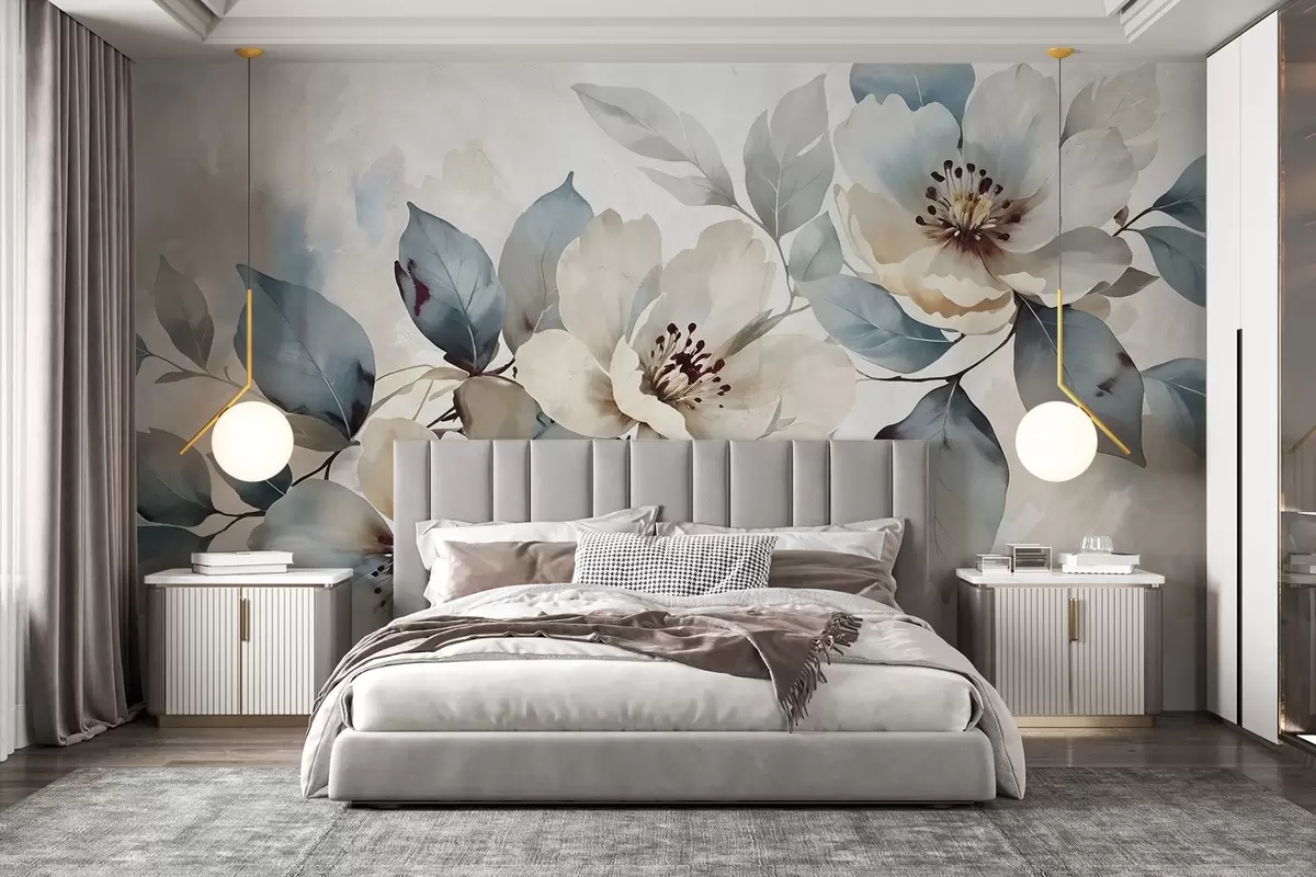 Fototapetai Švelni akvarelės tekstūros balta ir mėlyna gėlių kompozicija su minkštais žiedlapiais ir centrais Nr. w08401