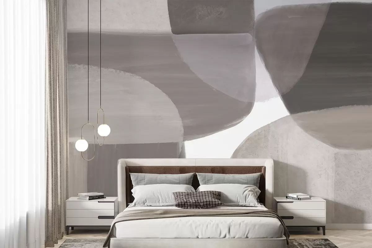 Fototapetai Vienspalvis abstraktus raštas su persidengiančiomis minimalistinėmis pilkos ir smėlio atspalvių formomis ir formomis. Nr. w08410v1