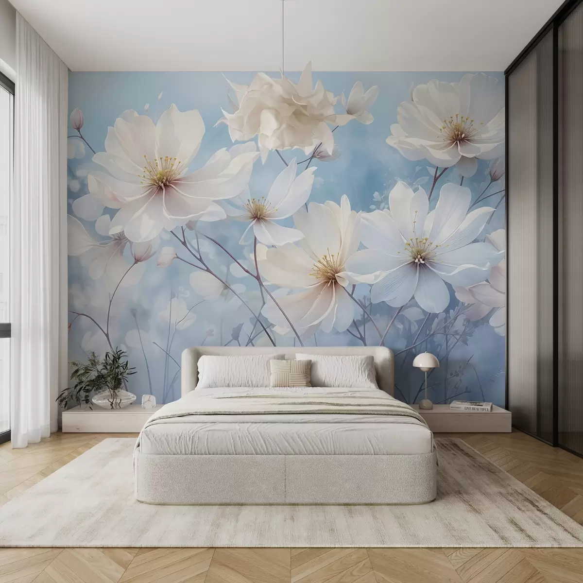 Fototapetai Švelnios baltos gėlės su švelniais žiedlapiais neryškiame mėlyname fone sukuria ramią ir nežemišką atmosferą Nr. w08412