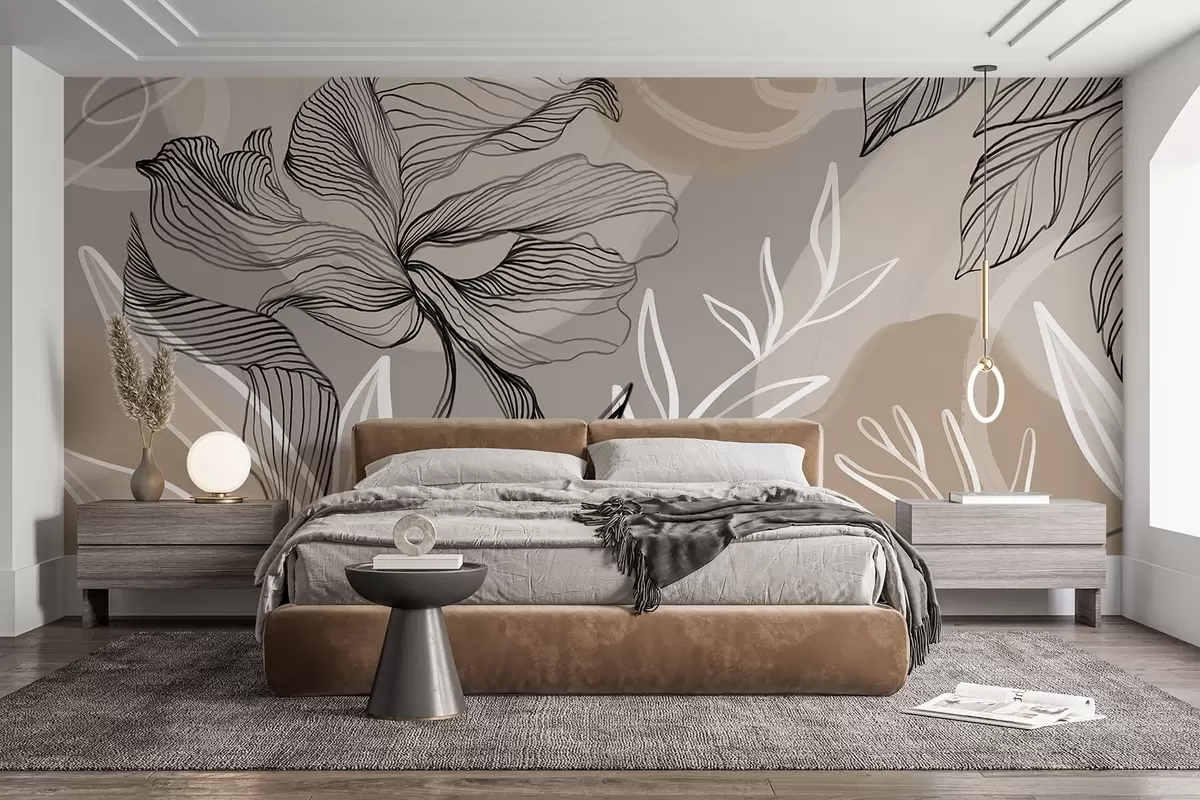 Fototapetai Elegantiškas gėlių raštas su didelėmis abstrakčiomis linijų gėlėmis ir lapais pilkų ir smėlio atspalvių šviesiame fone Nr. w08413