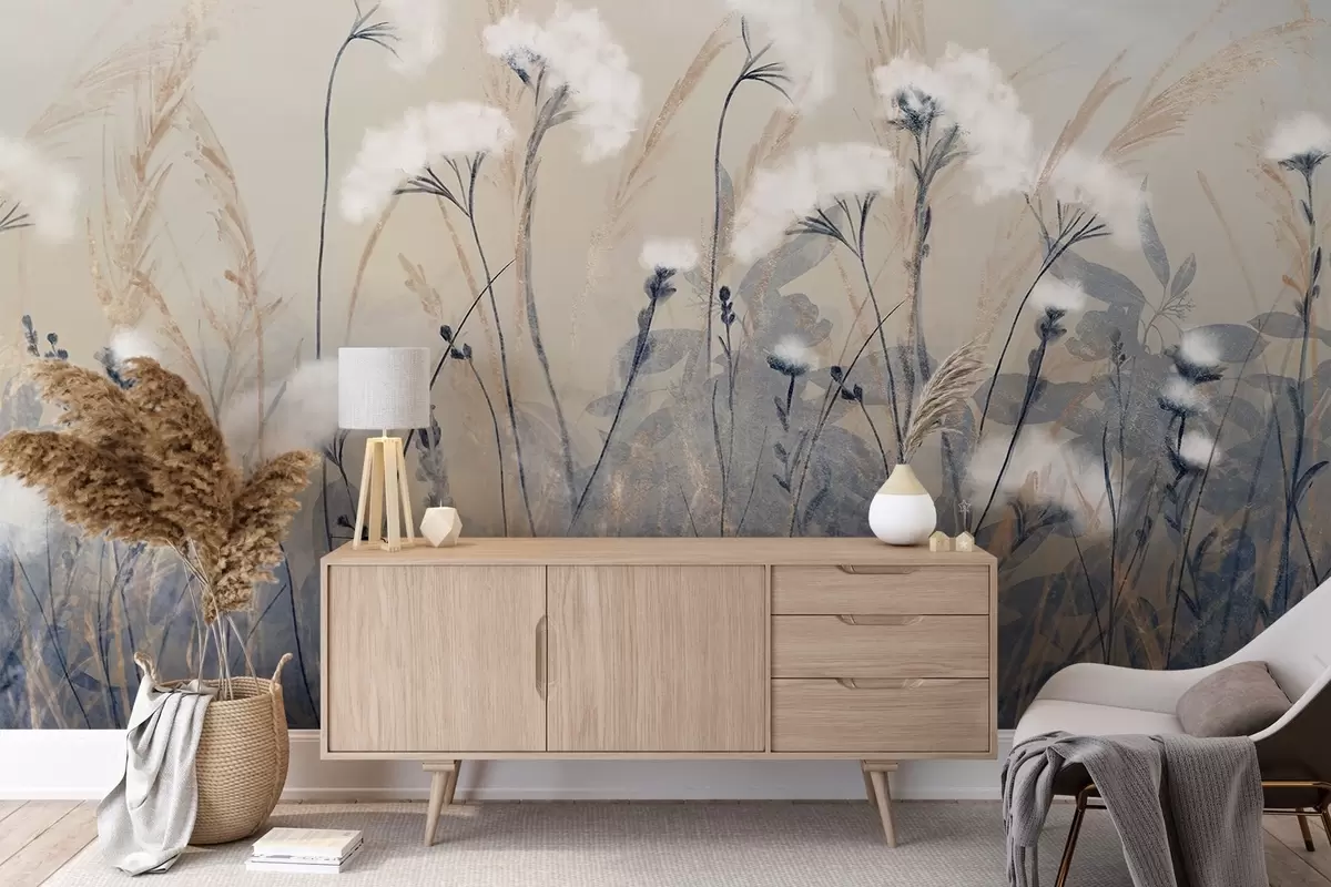 Fototapetai Puri balta medvilninė žolė neryškios tekstūros fone, švelni, miglota ir rami atmosfera Nr. w08416