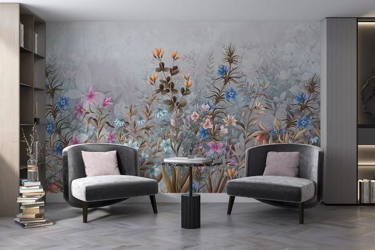 Fototapetai Gausus, ryškus gėlių tekstūrinis raštas su spalvingomis gėlėmis ir augalais, pasižyminčiais sudėtingomis detalėmis ir tekstūromis Nr. w08428