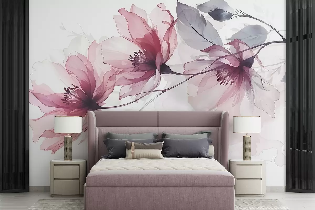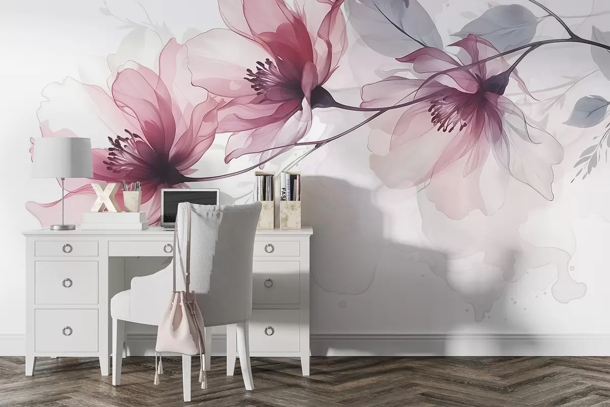 Fototapetai Švelnios skaidrios rožinės ir pilkos spalvos gėlės su švelniais, neryškiais žiedlapiais baltame fone Nr. w08429