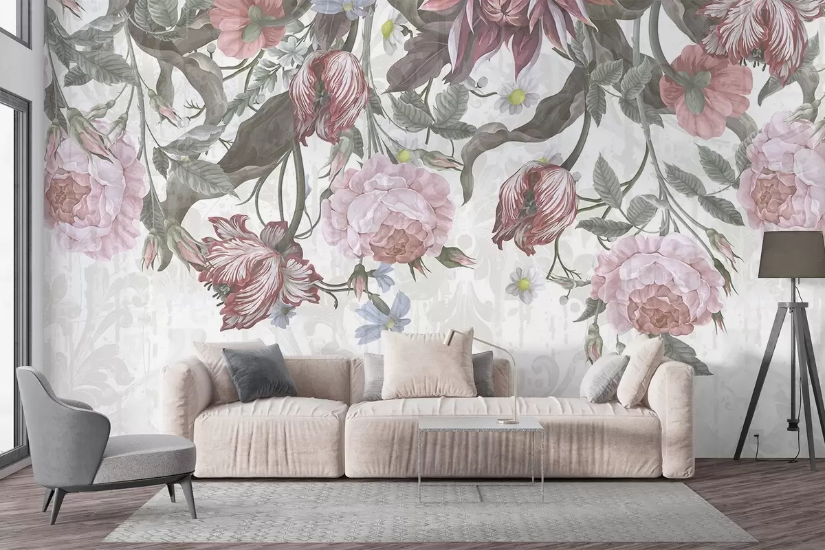Fototapetai Sodri gėlių kompozicija su didelėmis rausvomis ir baltomis gėlėmis, žaliais lapais ir stiebais Nr. w08435