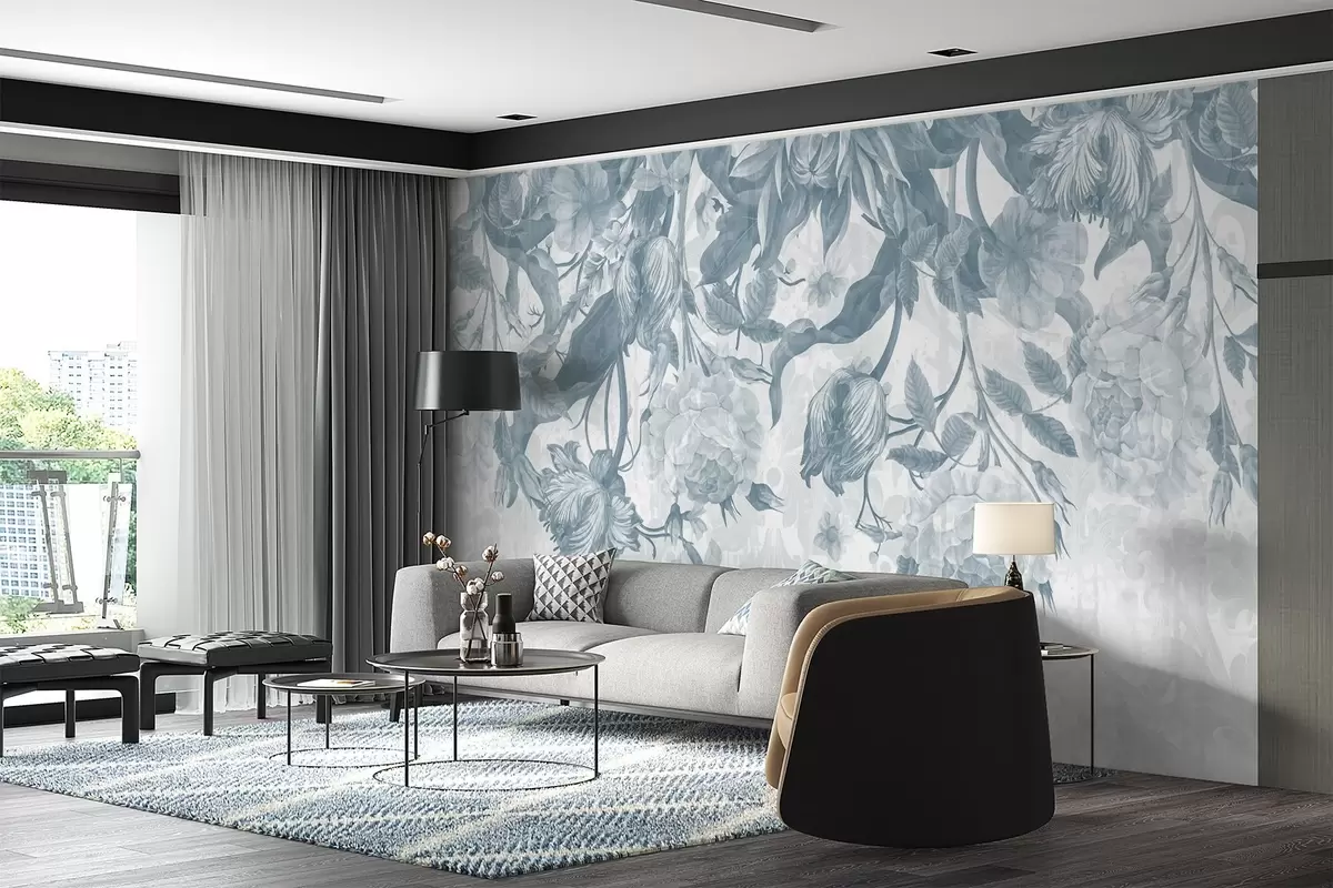 Fototapetai Sodri gėlių kompozicija su didelėmis mėlynomis ir baltomis gėlėmis, pastelinės mėlynos spalvos lapais ir stiebais Nr. w08435v1