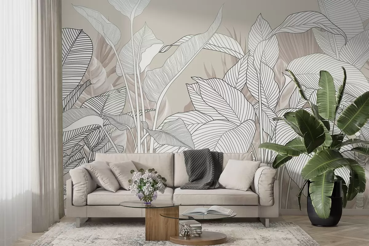 Fototapetai Nespalvota iliustracija, kurioje pavaizduoti dideli stilizuoti lapai ir lapija su sudėtingais linijų raštais ir tekstūromis Nr. w08436v1