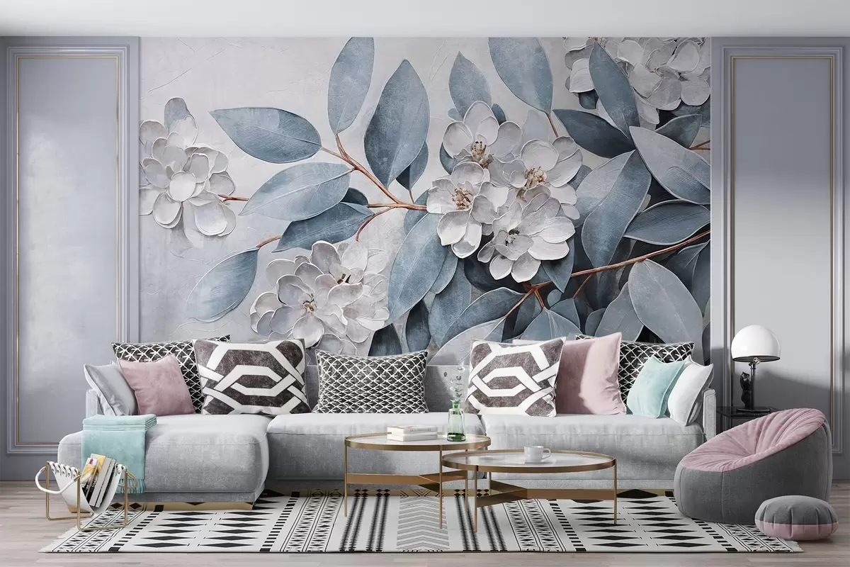 Fototapetai Švelnios baltos gėlės su pilkai žaliais lapais švelniame, prislopintame fone aliejinės tapybos stiliumi Nr. w08437