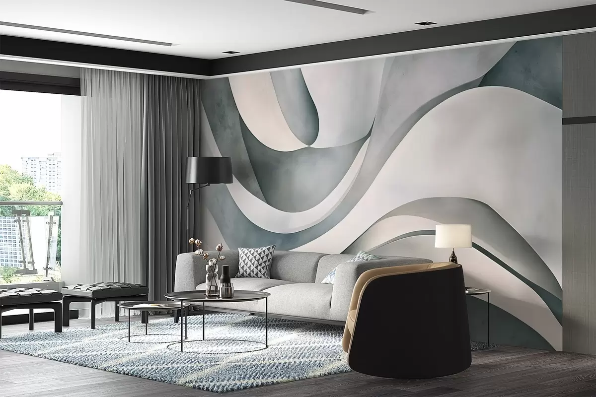Fototapetai Baltos, mėlynos ir pilkos spalvos išlenktos formos ir piešiniai, sukuriantys abstraktų tekstūrinį šiuolaikinį minimalistinį atspaudą Nr. w08439v1