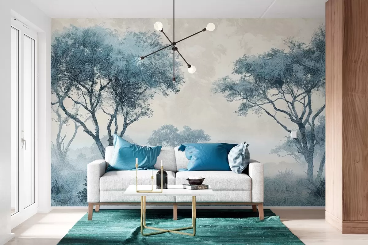 Fototapetai Miglotas, ramus kraštovaizdis su medžių siluetais pirmame plane, kuriame tvyro švelnus mėlynos ir smėlio atspalvių rūkas Nr. w08442
