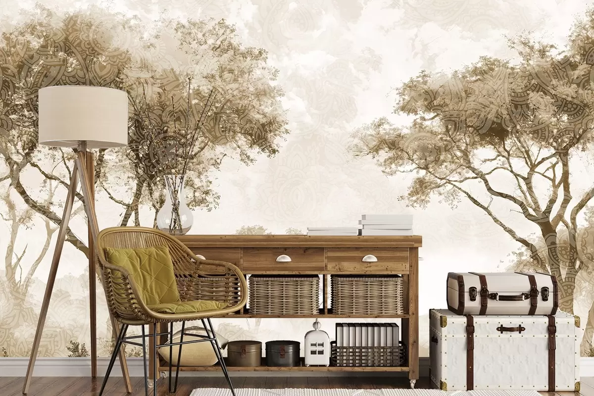 Fototapetai Miglotas, ramus kraštovaizdis su medžių siluetais pirmame plane ir švelniu rudų ir smėlio atspalvių rūku Nr. w08442v2