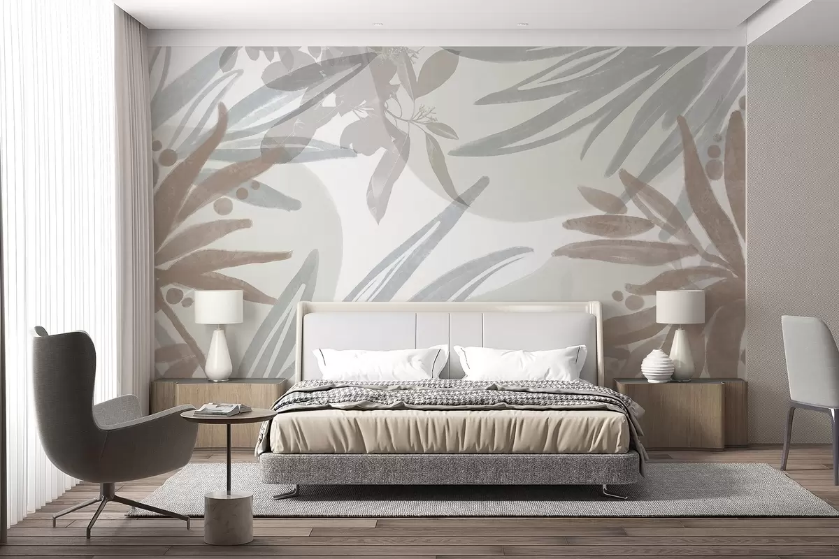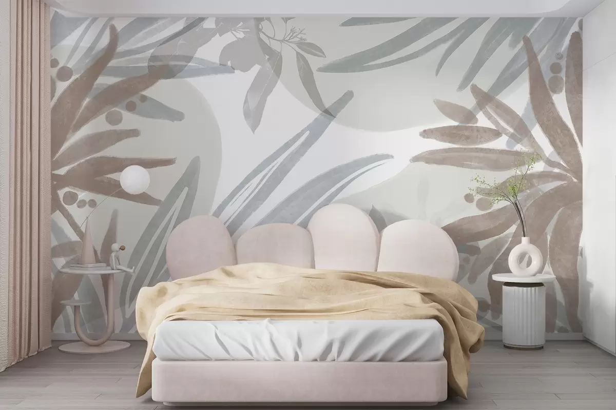 Fototapetai Neutralių tonų abstraktus gėlių raštas su persidengiančiais pilkų , baltų ir smėlio atspalvių lapais ir formomis Nr. w08464